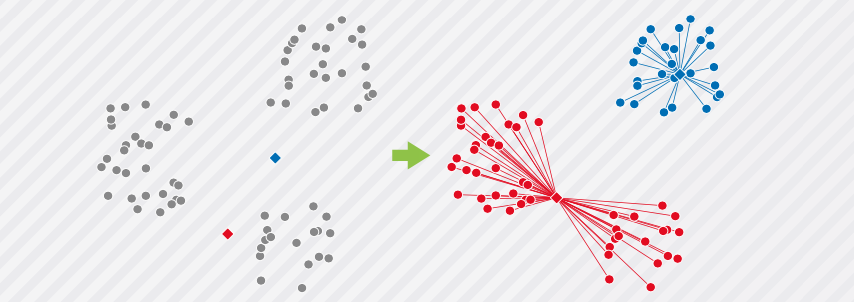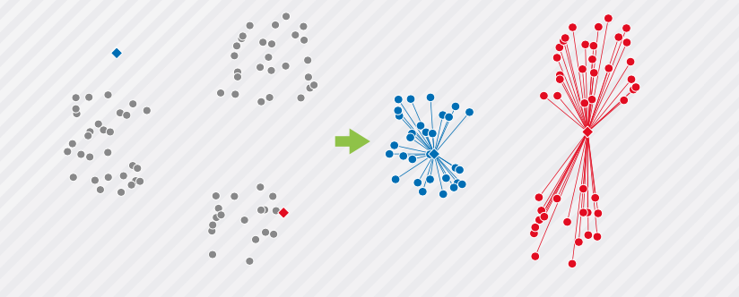 下面的示例中每个点都代表 1 个数据,在平面上位置较为相近、被圈起来的点就代表一类相似的数据。