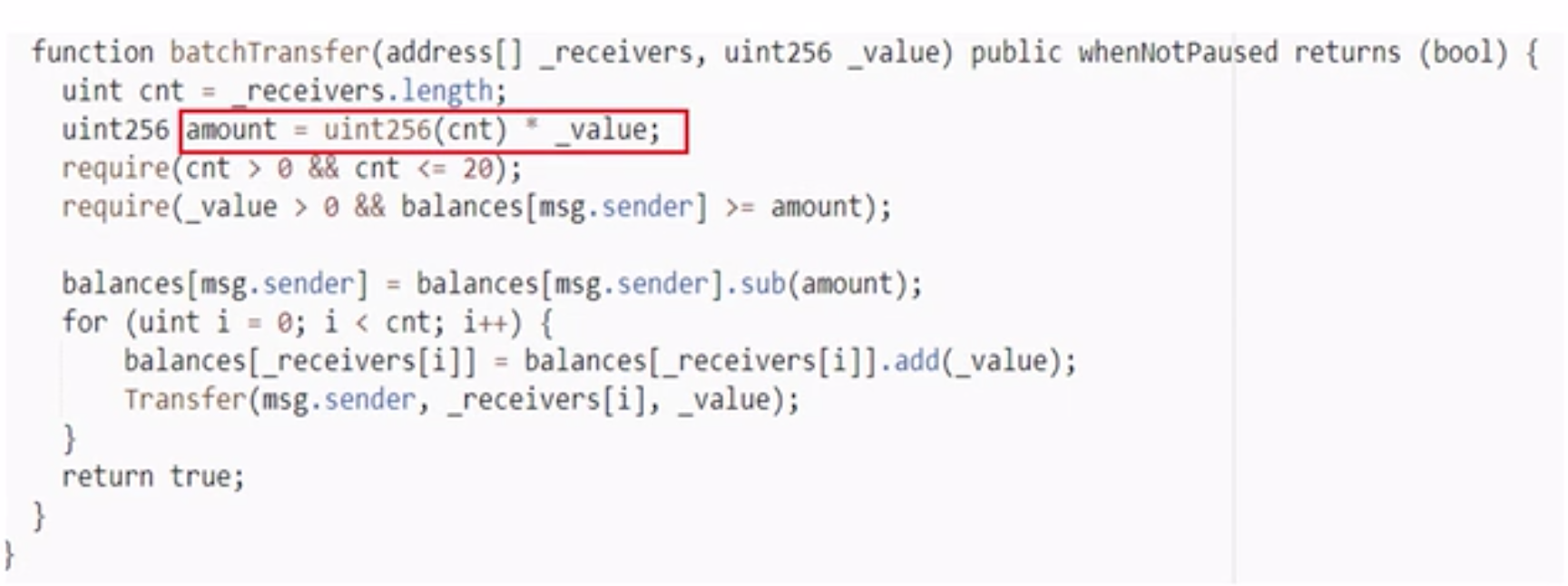因为下面的代码在计算时出现了溢出,从而导致被攻击,凭空出现了很多的代币BEC